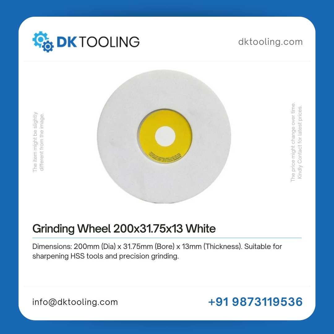 Dimensions: 200mm (Dia) x 31.75mm (Bore) x 13mm (Thickness). Suitable for sharpening HSS tools and precision grinding.